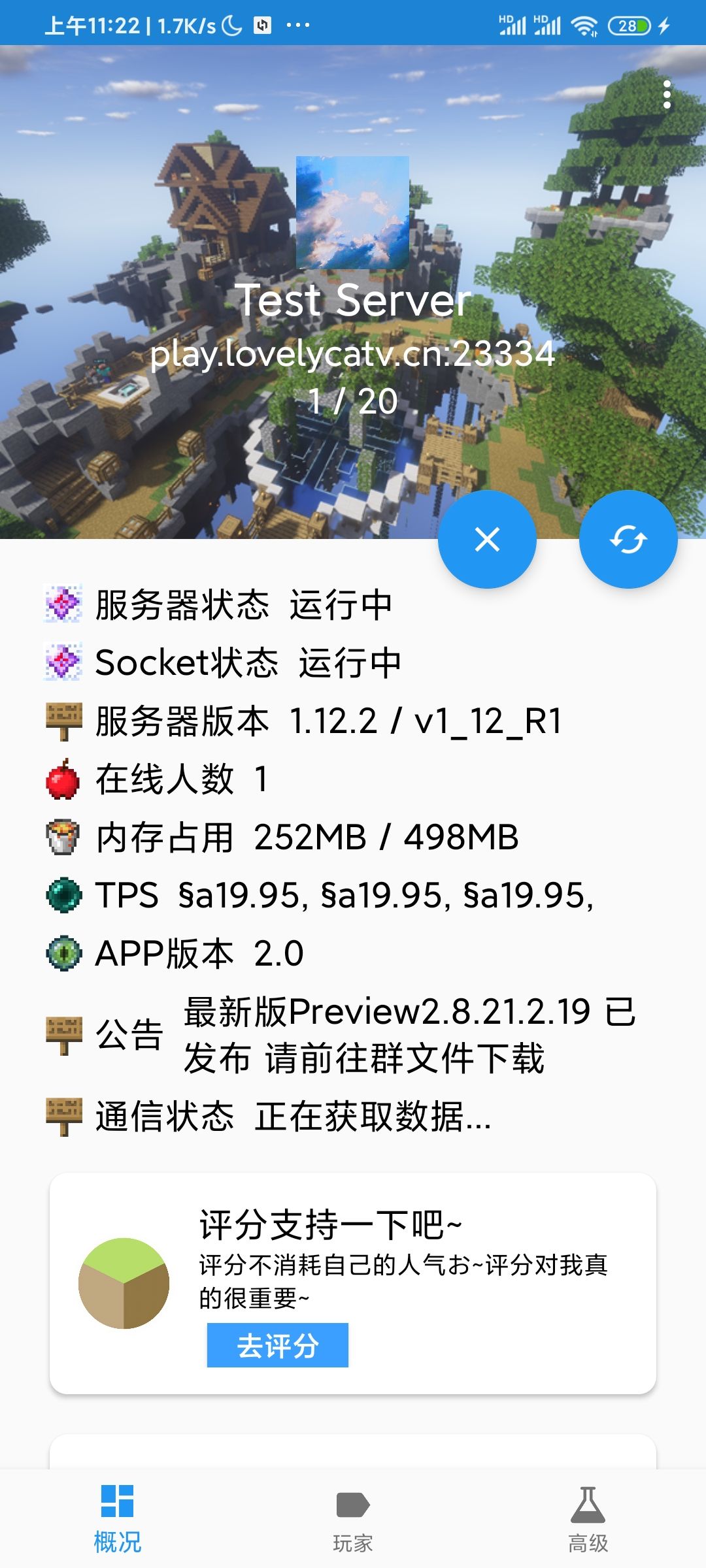 <本文档为第四修改版 最后更新时间 2020-2-26>食用方法:1、安装插件2、启动服务器3、生成配置文件4、关闭服务器5、配置Mysql并将相关信息填入插件的配置文件 (必要6、注册账号 (必要 (使用/ss help获取帮助7、查看配置文件,记下socket端口,默认233338、打开app 右上角添加服务器 填写正确信息即可9、如果你有任何问题,请先看下面的注意事项!APP的一些操作:1.APP主界面右上角菜单内含有服务器列表、切换服务器、崩溃日志、设置2.服务器列表内服务器可进入编辑,进入编辑界面后右上角可一键复制服务器信息3.服务器列表内右上角可以一键从剪切板添加服务器(仅限一个)4.崩溃日志右下角悬浮按钮内可一键清除日志信息5.数据自动刷新频率可在设置中找到其他开放功能:1.任何人可通过使用/ss report <Message> 反馈问题,拥有APP功能的管理员可在高级内找到玩家反馈面板 在内可直接进行回复 玩家上线后将会收到回复 (仅此一次)已回复的信息将会标红显示 未处理则为绿色2.更多开放功能敬请期待 (希望各位多多提议注意(Warning):本群拒绝伸手党,如果你不能自己动手解决问题,那么我也无能为力。(请不要问MySQL在哪下载、怎么安装等百度问题,如果你真的不会MySQL,建议学一学,许多插件也支持MySQL)(再者本插件MySQL是必须依赖项,并且无删除它的计划)注意2(Warning):1、如果没有配置好MySQL或填错服务器信息的问题,请先自己仔细检查再来反馈,我不是来帮你找错的,谢谢配合2、如果你不会安装Mysql或不了解,请使用宝塔面板一键安装Mysql (传送门 https://www.bt.cn/ 安装教程 https://www.bt.cn/bbs/thread-19376-1-1.html)3、若正确配置好插件和Mysql后APP只能获取到服务器头像与人数,请检查是否开放Socket端口4、若获取服务器信息时APP崩溃闪退,请先检查服务器信息是否填写正确 (不要忘了还有账号密码!!5、若TPS不能正常获取,请检查是否安装PlaceholderAPI,若已安装,请使用papi ecloud download Server命令并重载papi插件6、面板服请先找服务商了解是否可以开放更多端口,并将Socket端口填写为开放且未被占用的端口7、如果你的设备无法安装APP,8、还不能解决,欢迎反馈BUG,感谢支持!多端口,并将Socket端口填写为开放且未被占用的端口7、如果你的设备无法安装APP,8、还不能解决,欢迎反馈BUG,感谢支持!