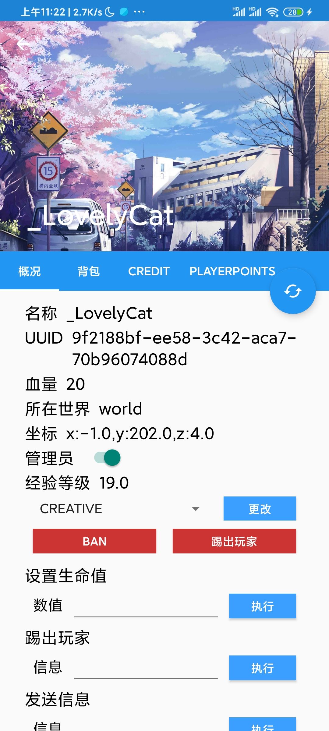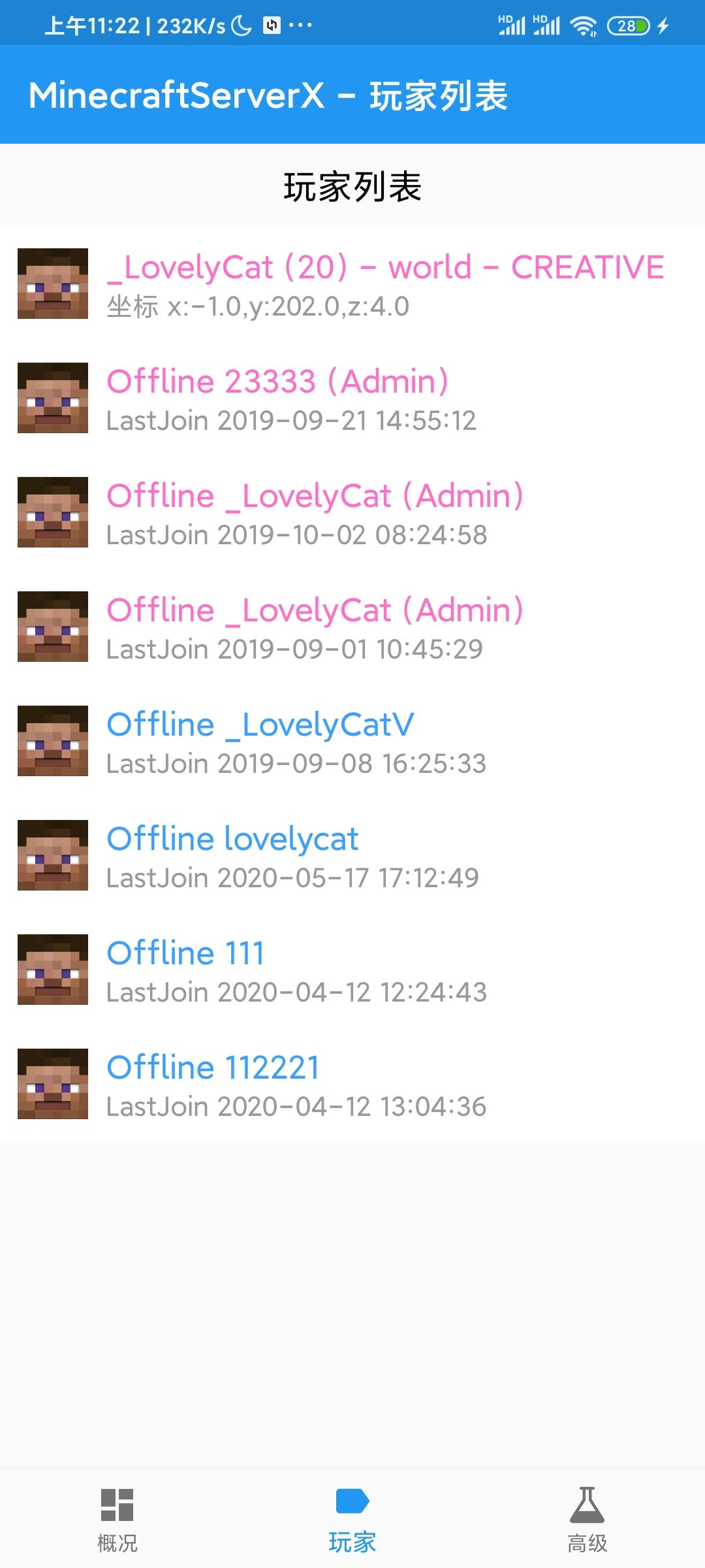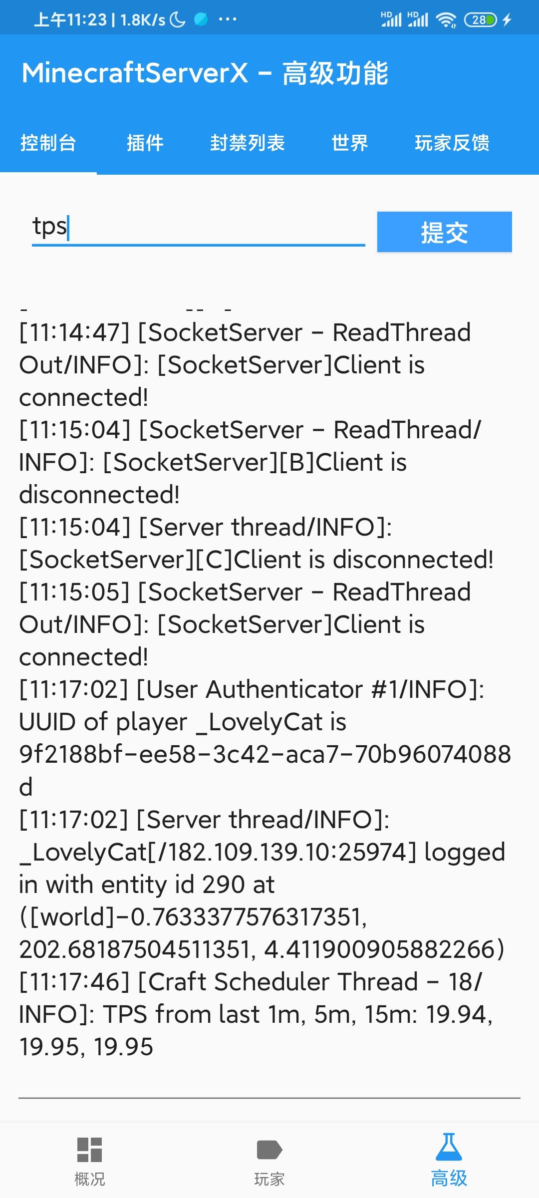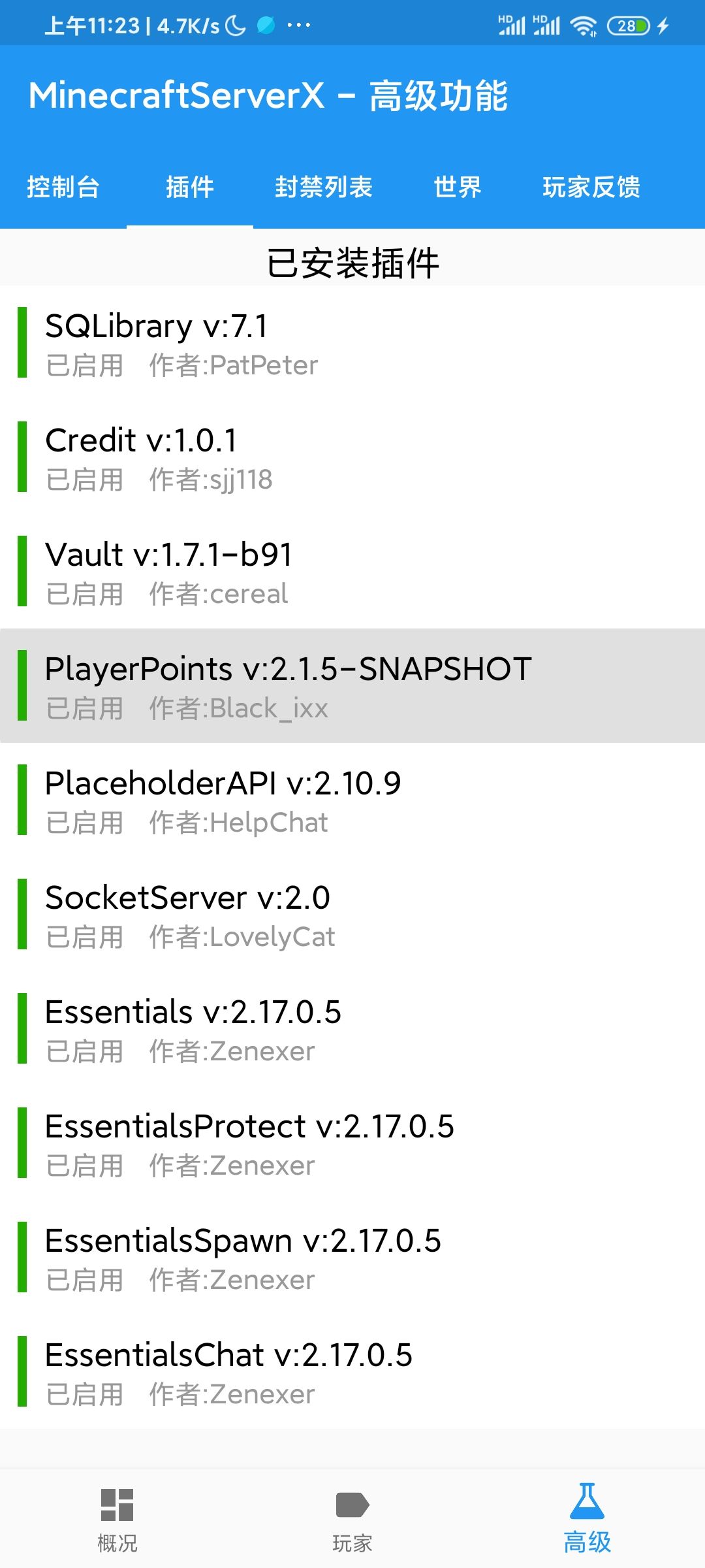 这是一个可以在手机上方便管理服务器的插件,实现了服务器状态监测、玩家管理、插件热卸载/安装、控制玩家背包等多种功能,结合了Vault经济插件。注意:本插件需要配合APP使用,非Android端不可用,若你的服务器只开放一个端口,插件不可用。如果服务器显示运行中而Socket显示已关闭或一直获取中,请检查Socket端口是否开放如果你是VPS/淘宝租赁服/面板服,请询问客户开放端口